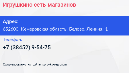 Игрушкино, сеть магазинов по адресу 652600, Кемеровская область, Белово, Ленина, 1 в дальнейшем Организация, размещена в следующих категориях: