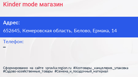 Kinder mode, магазин по адресу 652645, Кемеровская область, Белово, Ермака, 14 в дальнейшем Организация, размещена в следующих категориях: