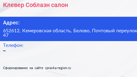 Клевер Соблазн, салон по адресу 652612, Кемеровская область, Белово, Почтовый переулок, 47 в дальнейшем Организация, размещена в следующих категориях: