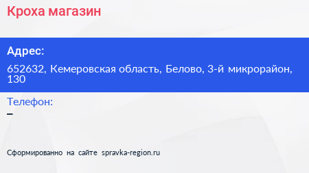 Кроха, магазин по адресу 652632, Кемеровская область, Белово, 3-й микрорайон, 130 в дальнейшем Организация, размещена в следующих категориях: