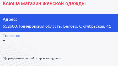 Ксюша, магазин женской одежды по адресу 652600, Кемеровская область, Белово, Октябрьская, 41 в дальнейшем Организация, размещена в следующих категориях: