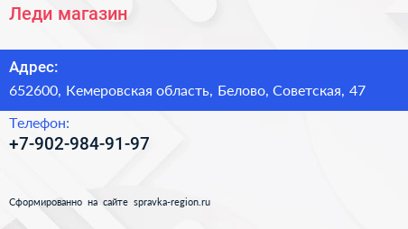 Леди, магазин по адресу 652600, Кемеровская область, Белово, Советская, 47 в дальнейшем Организация, размещена в следующих категориях: