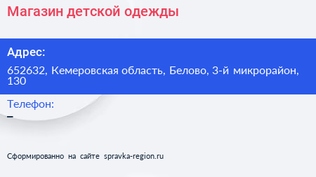 Магазин детской одежды по адресу 652632, Кемеровская область, Белово, 3-й микрорайон, 130 в дальнейшем Организация, размещена в следующих категориях: