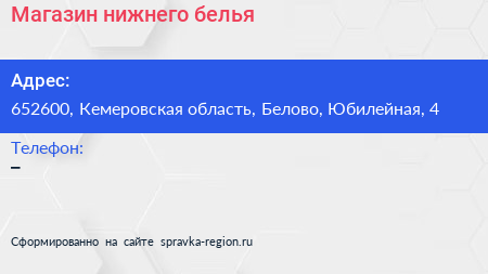 Магазин нижнего белья по адресу 652600, Кемеровская область, Белово, Юбилейная, 4 в дальнейшем Организация, размещена в следующих категориях: