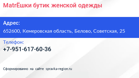 MatrЁшки, бутик женской одежды по адресу 652600, Кемеровская область, Белово, Советская, 25 в дальнейшем Организация, размещена в следующих категориях: