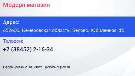 Модерн, магазин по адресу 652600, Кемеровская область, Белово, Юбилейная, 16 в дальнейшем Организация, размещена в следующих категориях: