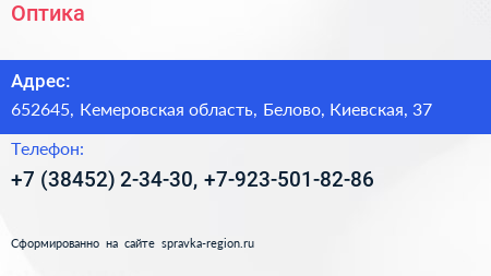 Оптика по адресу 652645, Кемеровская область, Белово, Киевская, 37 в дальнейшем Организация, размещена в следующих категориях: