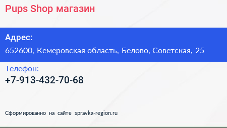 Pups Shop, магазин по адресу 652600, Кемеровская область, Белово, Советская, 25 в дальнейшем Организация, размещена в следующих категориях: