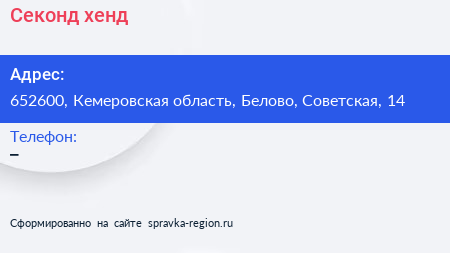 Секонд-хенд по адресу 652600, Кемеровская область, Белово, Советская, 14 в дальнейшем Организация, размещена в следующих категориях: