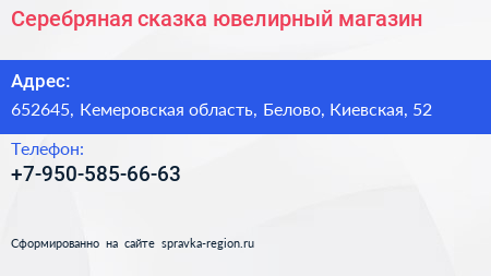 Серебряная сказка, ювелирный магазин по адресу 652645, Кемеровская область, Белово, Киевская, 52 в дальнейшем Организация, размещена в следующих категориях: