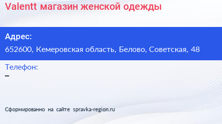 Valentt, магазин женской одежды по адресу 652600, Кемеровская область, Белово, Советская, 48 в дальнейшем Организация, размещена в следующих категориях: