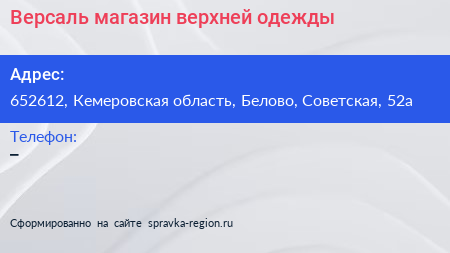 Версаль, магазин верхней одежды по адресу 652612, Кемеровская область, Белово, Советская, 52а в дальнейшем Организация, размещена в следующих категориях: