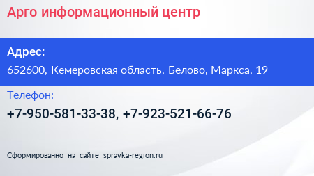 Арго, информационный центр по адресу 652600, Кемеровская область, Белово, Маркса, 19 в дальнейшем Организация, размещена в следующих категориях: