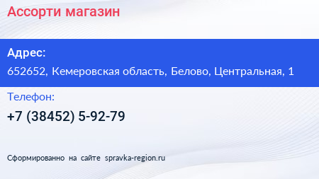 Ассорти, магазин по адресу 652652, Кемеровская область, Белово, Центральная, 1 в дальнейшем Организация, размещена в следующих категориях:
