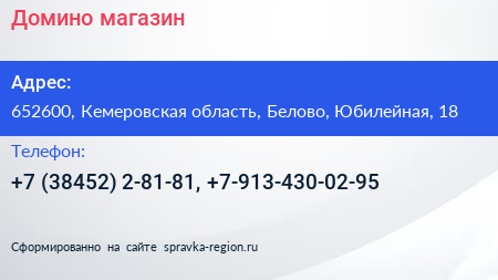 Домино, магазин по адресу 652600, Кемеровская область, Белово, Юбилейная, 18 в дальнейшем Организация, размещена в следующих категориях: