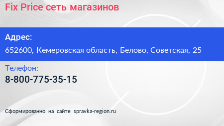 Fix Price, сеть магазинов по адресу 652600, Кемеровская область, Белово, Советская, 25 в дальнейшем Организация, размещена в следующих категориях: