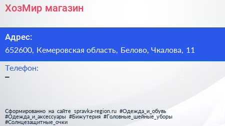 ХозМир, магазин по адресу 652600, Кемеровская область, Белово, Чкалова, 11 в дальнейшем Организация, размещена в следующих категориях: