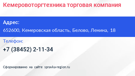 Кемеровоторгтехника, торговая компания по адресу 652600, Кемеровская область, Белово, Ленина, 18 в дальнейшем Организация, размещена в следующих категориях: