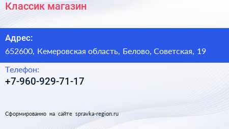 Классик, магазин по адресу 652600, Кемеровская область, Белово, Советская, 19 в дальнейшем Организация, размещена в следующих категориях: