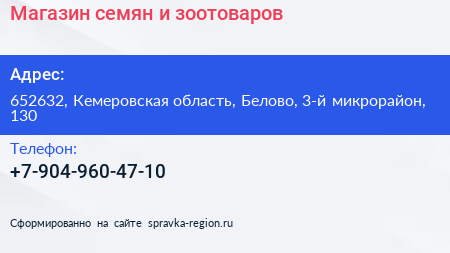 Магазин семян и зоотоваров по адресу 652632, Кемеровская область, Белово, 3-й микрорайон, 130 в дальнейшем Организация, размещена в следующих категориях: