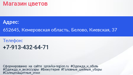 Магазин цветов по адресу 652645, Кемеровская область, Белово, Киевская, 37 в дальнейшем Организация, размещена в следующих категориях: