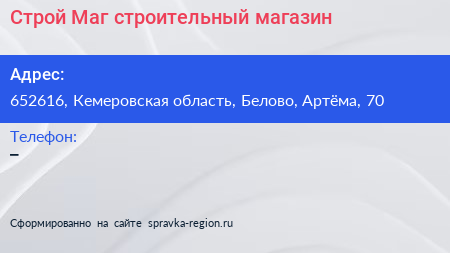 Строй-Маг, строительный магазин по адресу 652616, Кемеровская область, Белово, Артёма, 70 в дальнейшем Организация, размещена в следующих категориях: