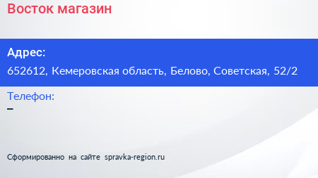 Восток, магазин по адресу 652612, Кемеровская область, Белово, Советская, 52/2 в дальнейшем Организация, размещена в следующих категориях:
