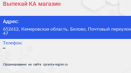 Выпекай.КА, магазин по адресу 652612, Кемеровская область, Белово, Почтовый переулок, 47 в дальнейшем Организация, размещена в следующих категориях:
