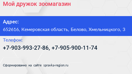 Мой дружок, зоомагазин по адресу 652616, Кемеровская область, Белово, Хмельницкого, 3 в дальнейшем Организация, размещена в следующих категориях:
