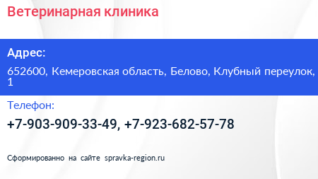 Ветеринарная клиника по адресу 652600, Кемеровская область, Белово, Клубный переулок, 1 в дальнейшем Организация, размещена в следующих категориях: