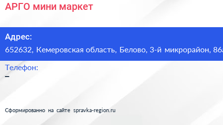АРГО, мини-маркет по адресу 652632, Кемеровская область, Белово, 3-й микрорайон, 86а в дальнейшем Организация, размещена в следующих категориях: