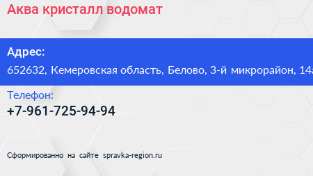 Аква кристалл, водомат по адресу 652632, Кемеровская область, Белово, 3-й микрорайон, 14а в дальнейшем Организация, размещена в следующих категориях: