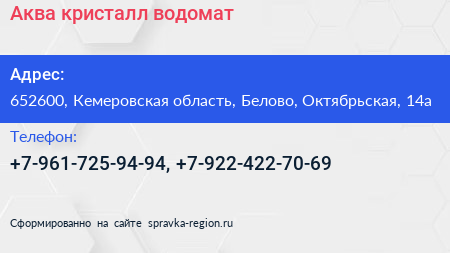 Аква кристалл, водомат по адресу 652600, Кемеровская область, Белово, Октябрьская, 14а в дальнейшем Организация, размещена в следующих категориях: