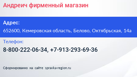 Андреич, фирменный магазин по адресу 652600, Кемеровская область, Белово, Октябрьская, 14а в дальнейшем Организация, размещена в следующих категориях: