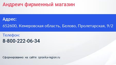 Андреич, фирменный магазин по адресу 652600, Кемеровская область, Белово, Пролетарская, 9/2 в дальнейшем Организация, размещена в следующих категориях: