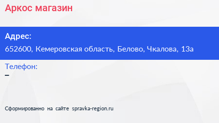 Аркос, магазин по адресу 652600, Кемеровская область, Белово, Чкалова, 13а в дальнейшем Организация, размещена в следующих категориях: