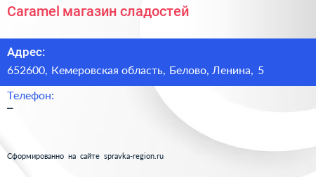 Caramel, магазин сладостей по адресу 652600, Кемеровская область, Белово, Ленина, 5 в дальнейшем Организация, размещена в следующих категориях: