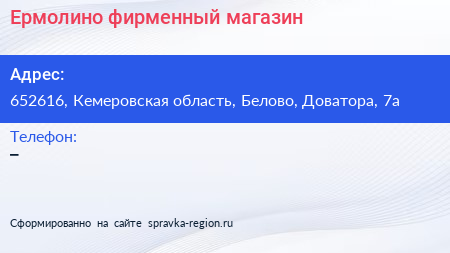 Ермолино, фирменный магазин по адресу 652616, Кемеровская область, Белово, Доватора, 7а в дальнейшем Организация, размещена в следующих категориях:
