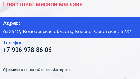 Fresh meat, мясной магазин по адресу 652612, Кемеровская область, Белово, Советская, 52/2 в дальнейшем Организация, размещена в следующих категориях: