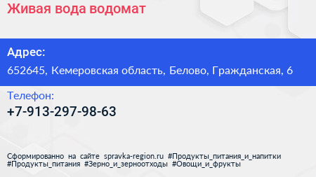 Живая вода, водомат по адресу 652645, Кемеровская область, Белово, Гражданская, 6 в дальнейшем Организация, размещена в следующих категориях: