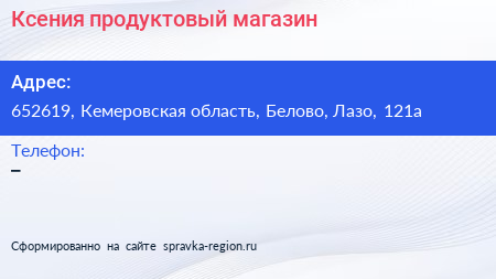 Ксения, продуктовый магазин по адресу 652619, Кемеровская область, Белово, Лазо, 121а в дальнейшем Организация, размещена в следующих категориях: