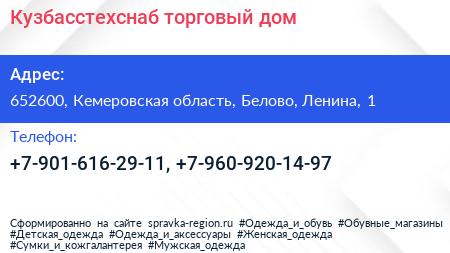 Кузбасстехснаб, торговый дом по адресу 652600, Кемеровская область, Белово, Ленина, 1 в дальнейшем Организация, размещена в следующих категориях: