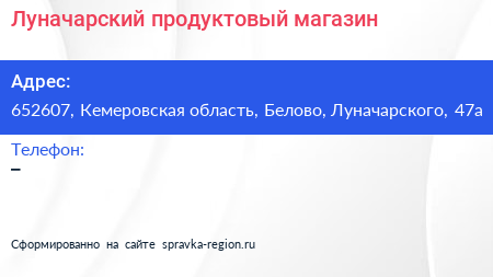 Луначарский, продуктовый магазин по адресу 652607, Кемеровская область, Белово, Луначарского, 47а в дальнейшем Организация, размещена в следующих категориях: