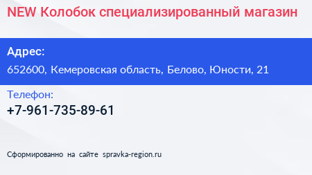 NEW Колобок, специализированный магазин по адресу 652600, Кемеровская область, Белово, Юности, 21 в дальнейшем Организация, размещена в следующих категориях: