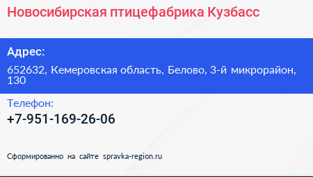 Новосибирская птицефабрика-Кузбасс по адресу 652632, Кемеровская область, Белово, 3-й микрорайон, 130 в дальнейшем Организация, размещена в следующих категориях: