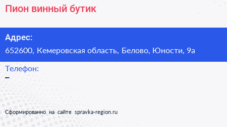 Пион, винный бутик по адресу 652600, Кемеровская область, Белово, Юности, 9а в дальнейшем Организация, размещена в следующих категориях: