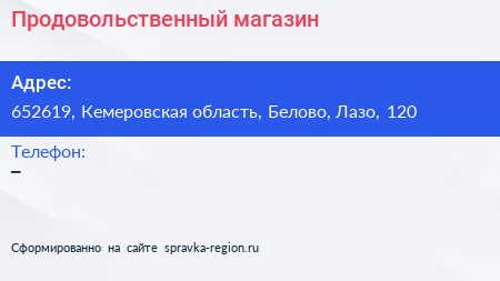 Продовольственный магазин по адресу 652619, Кемеровская область, Белово, Лазо, 120 в дальнейшем Организация, размещена в следующих категориях: