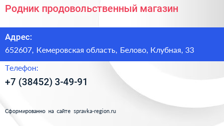 Родник, продовольственный магазин по адресу 652607, Кемеровская область, Белово, Клубная, 33 в дальнейшем Организация, размещена в следующих категориях: