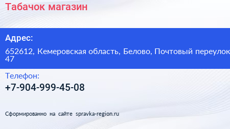 Табачок, магазин по адресу 652612, Кемеровская область, Белово, Почтовый переулок, 47 в дальнейшем Организация, размещена в следующих категориях: