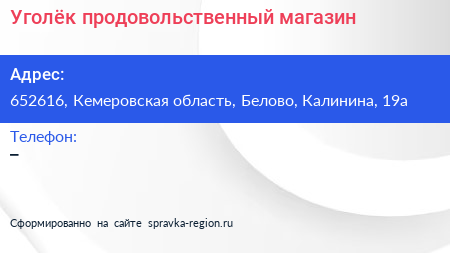 Уголёк, продовольственный магазин по адресу 652616, Кемеровская область, Белово, Калинина, 19а в дальнейшем Организация, размещена в следующих категориях: